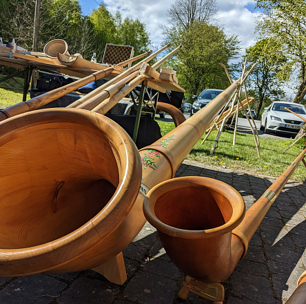 Das dreitägige internationale Alphornfestival vom 26.-28.04.24 war ein wahres Erlebnis mit Workshops, Konzerte, und Alphornausstellungen. Mitten im schönen Rüthener Bibertal bot es einen Anblick - und einen Klang - , den man nicht oft erlebt. In diesem schönen Settung versteigerte Organisator Herr Hubert Hense eines seiner selbstgebauten Alphörner für den guten Zweck, was eine Spende von 1.500 Euro für das Hospiz einbrachte.