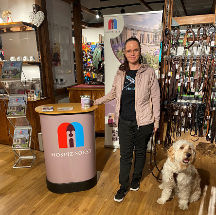 Im Dezember findet alljährlich der große Sonderverkauf vom Dogstyler in Soest statt - für geliebte Fellnasen gibt es dann qualitativ hochwertige Transportboxen, Körbchen und viel mehr zu reduzierten Preisen. Besonders toll: Von den Einnahmen ging in diesem Jahr eine Spendensumme von großartigen 1.400 Euro aus dem Sonderverkauf an das Christliche Hospiz! Zwei Tage lang begleiteten wir den Sonderverkauf mit einem Infostand vor Ort und standen für Fragen und Antworten rund um das Hospiz zur Verfügung.