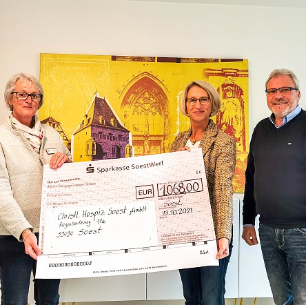 Acht Frauen, darunter Jutta Schmidt, ehrenamtliche Mitarbeiterin im Christlichen Hospiz Soest, treffen sich seit rund 14 Jahren monatlich zum Stricken. Der Verkauf der Strickwaren auf dem letzten Weihnachtsmarkt erbrachte einen Erlös von 1200 €. Dieser Betrag kam dem Hospiz für die Gestaltung des Raumes der Stille und der Trauerarbeit zu Gute. Ein Erinnerungsbaum, gläserne Tränen, ein Gedenkbuch und eine brennende Kerze bereichern nun den Raum.